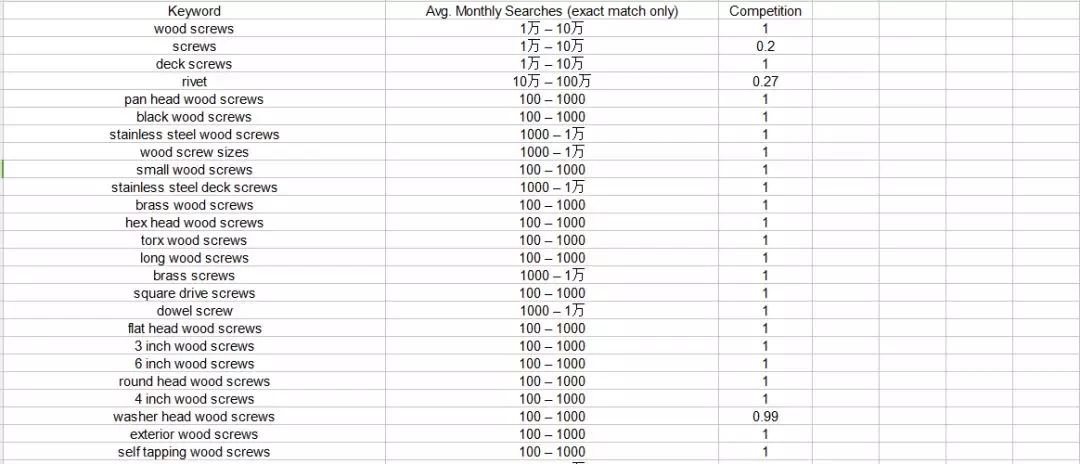 3 . 篩選完畢之后,剩下的就全部是包含wood screw的長尾關(guān)鍵詞。最后,將第2列(平均搜索量/月)的數(shù)據(jù)按照降序排列,這樣就可以找到搜索量很大的長尾關(guān)鍵詞。