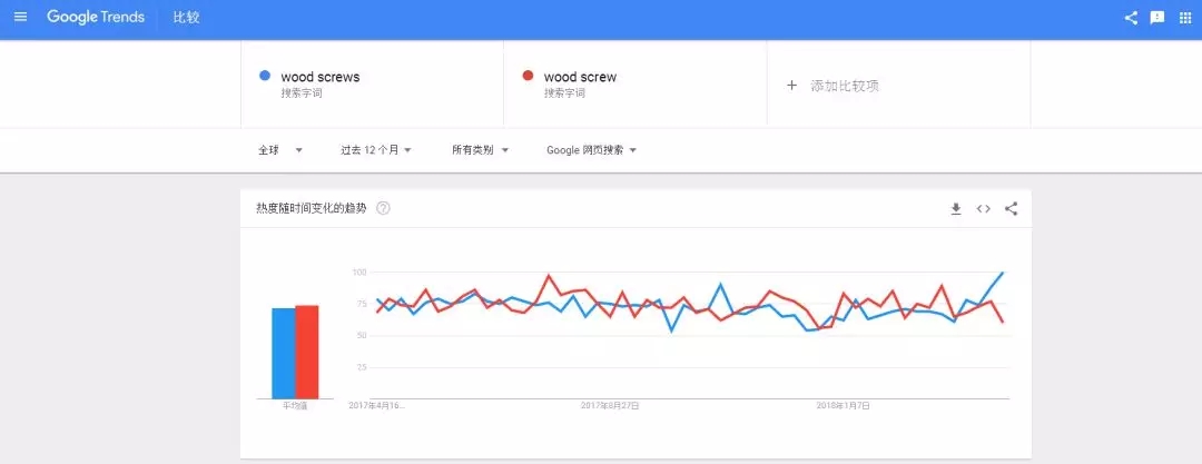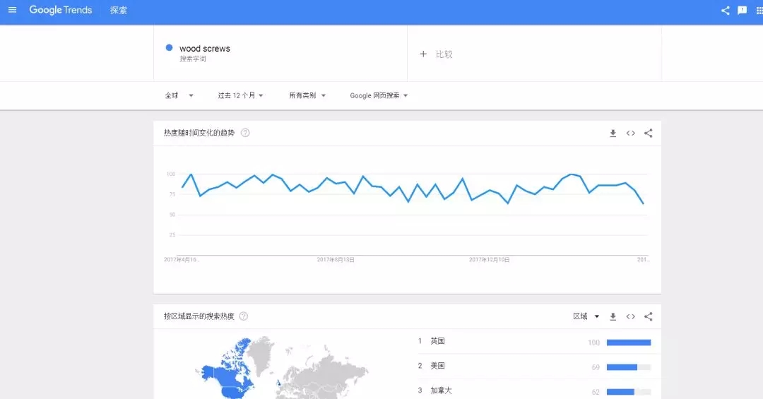 還是以上面的wood screw(核心詞)為例,在Google Trends的搜索欄內(nèi)輸入wood screw,我們看一下過去12個(gè)月里,這個(gè)產(chǎn)品在全球范圍的熱度表現(xiàn)。