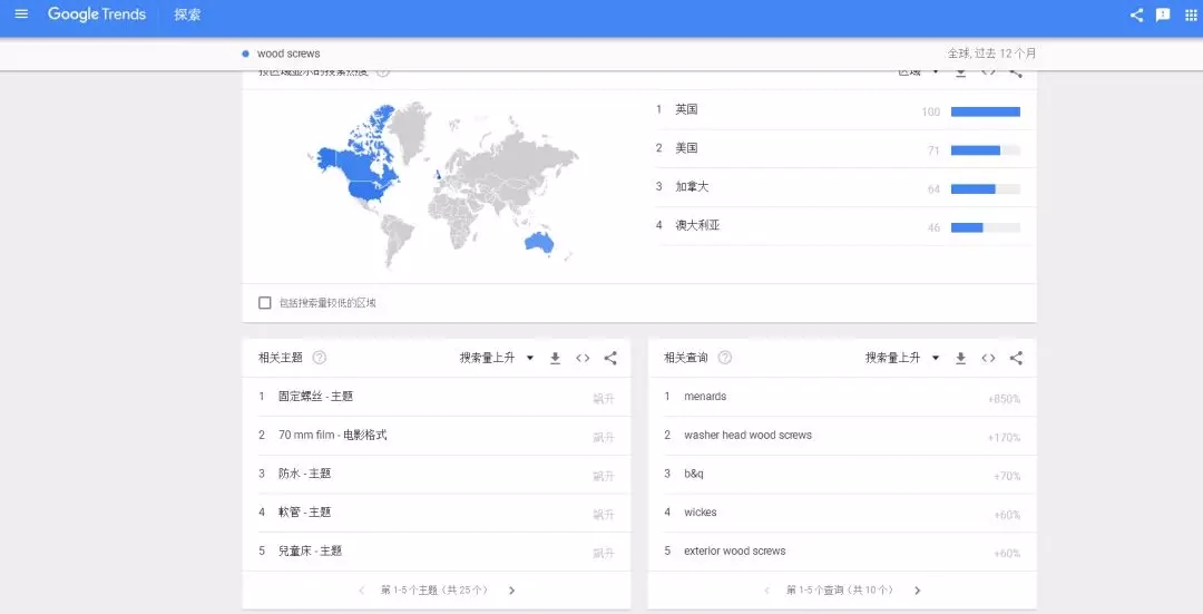 同時(shí),大家可以自己更換搜索條件。比如,我想看看:wood screw這個(gè)產(chǎn)品,在英國,在過去5年內(nèi),在房地產(chǎn)行業(yè),通過Google搜索的搜索趨勢。大家就可以自己選擇查詢條件,查看產(chǎn)品搜索趨勢。