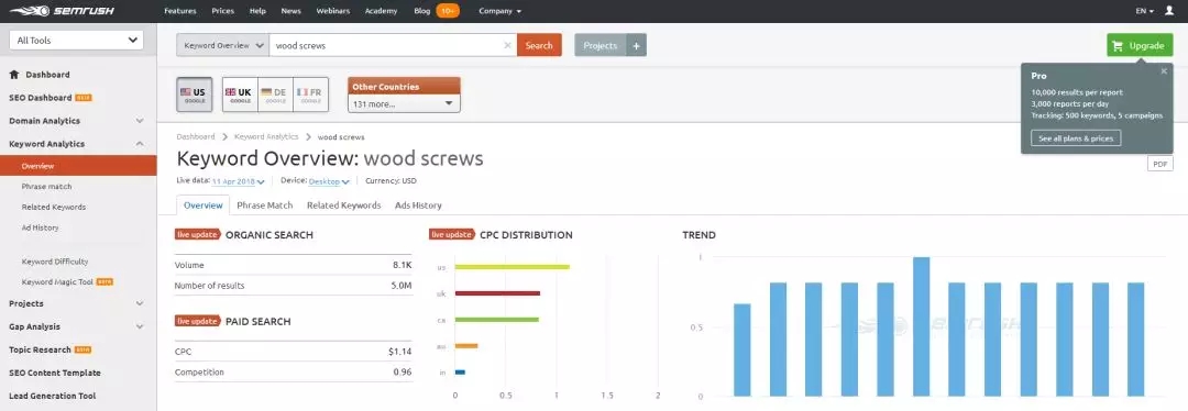以上就是,Semrush在做產(chǎn)品關(guān)鍵詞趨勢分析中的基本應(yīng)用。在這里需要做特殊說明的是,Semrush免費(fèi)版每天的搜索次數(shù)是受限的,而且搜索的數(shù)據(jù)也是受限的,不方便全面分析產(chǎn)品。