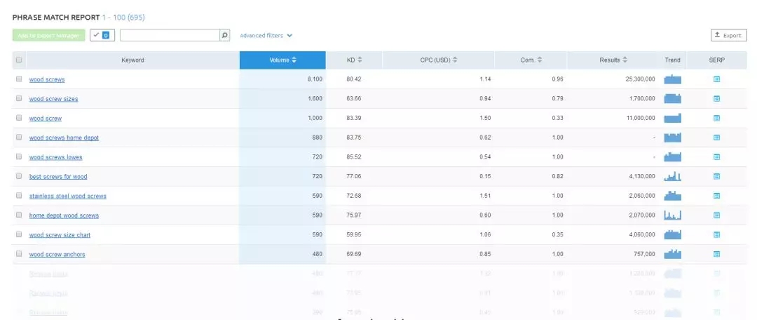 2 . 選擇Phrase Match Report(相關(guān)詞組報(bào)告),可以看到包含wood screw的長尾詞的相關(guān)數(shù)據(jù):月均搜索量、自然優(yōu)化難以程度、付費(fèi)競價(jià)建議出價(jià)、競爭度、索引量、趨勢。