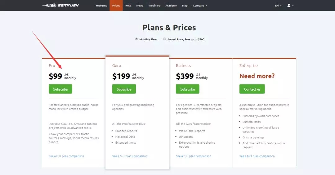 大家可以選擇付費(fèi)版,99刀/月的就可以,反正在做競爭對手分析、外鏈平臺搭建的時(shí)候,也要用到。(筆者這幾年,是一直用著,不要不舍得投入~)