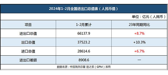 根據海關總署近日發(fā)布的最新外貿數據,今年前兩月,我國貨物貿易進出口總值6.61萬億元,同比增長8.7%。其中,出口總額為3.75萬億元,同比增長10.3%,進口總額為2.86萬億元,同比增長6.7%。貿易順差達到8908.7億元,較往年同期擴大了23.6%。