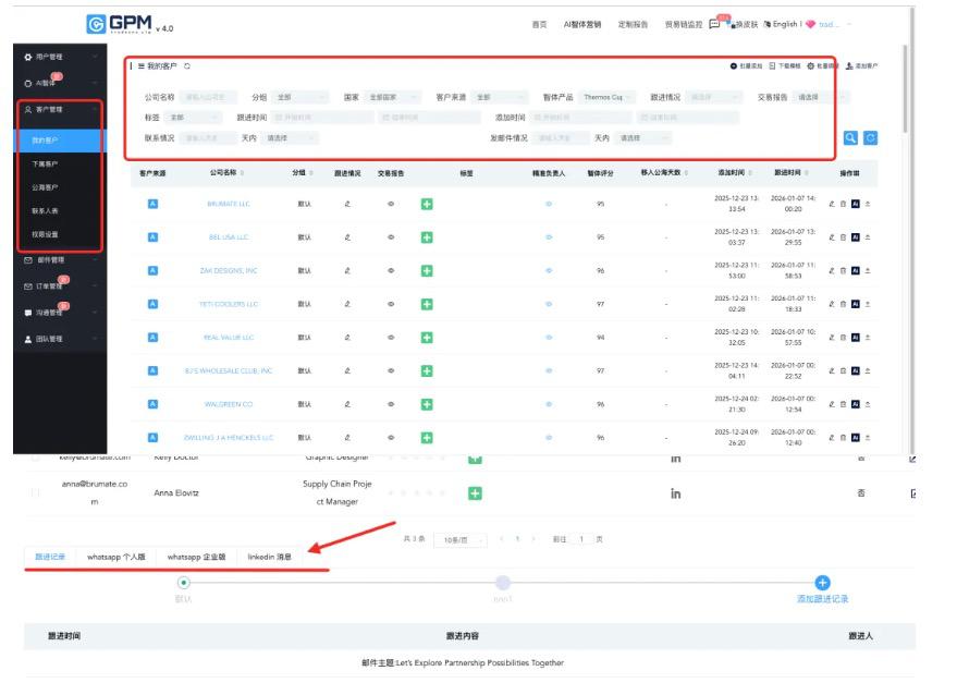 GPM-AI智能體同樣集成了功能全面的CRM客戶管理系統(tǒng),對不同意向客戶分級管理,WhatsApp、Linkedin聊天記錄也可以同步更新到CRM中, 讓您對每個客戶的合作進展都了然于胸。
